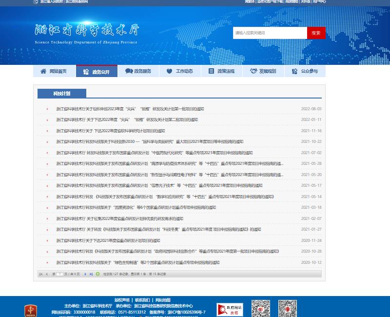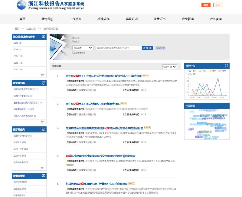 社会公众检索页面,分为左右两侧。左侧:只能聚类按年度对报告进行导航,右侧为报告检索结果。