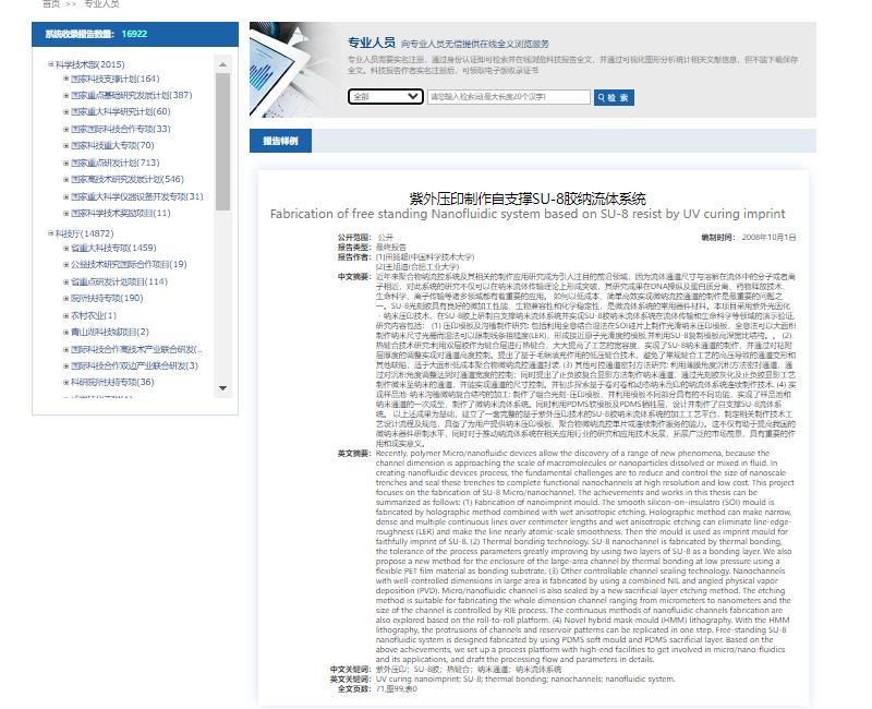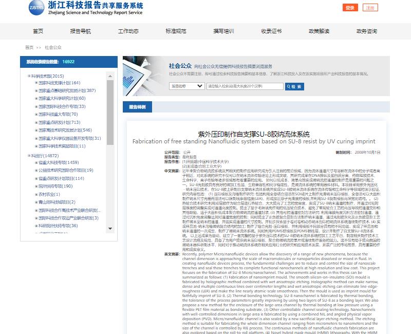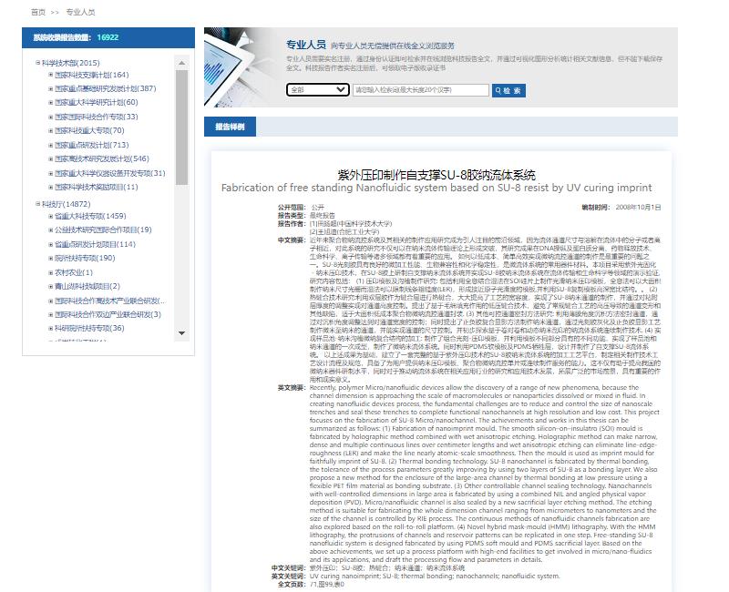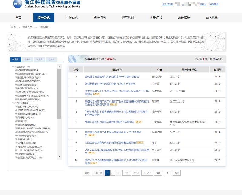 左边:用户可按(部门、学科、地域、类型)对报告进行检索,在右侧显示相应的结果。如图: