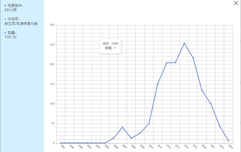 用户在折线图内选择具体的年份,系统将根据用户的选择在进一步对科技报告的数据进行检索,实现多层检索条件的叠加显示功能。