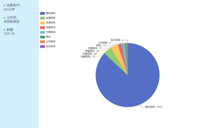 用户在饼图内选择具体的报告类型,系统将根据用户的选择在进一步对科技报告的数据进行检索,实现多层检索条件的叠加显示功能。