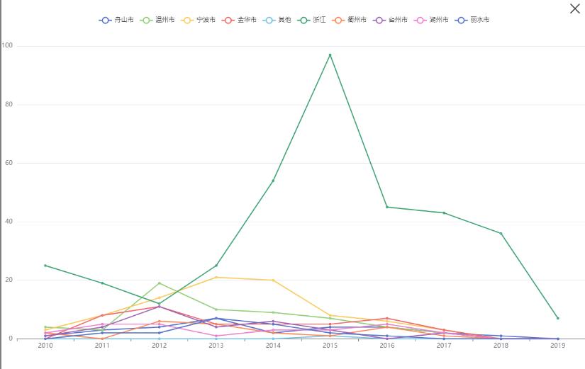 系统根据用户的检索条件,经过系统后台算法,将对检索的词根据地区发布的报告数据量按照年份的趋势进行统计,如图所示:
