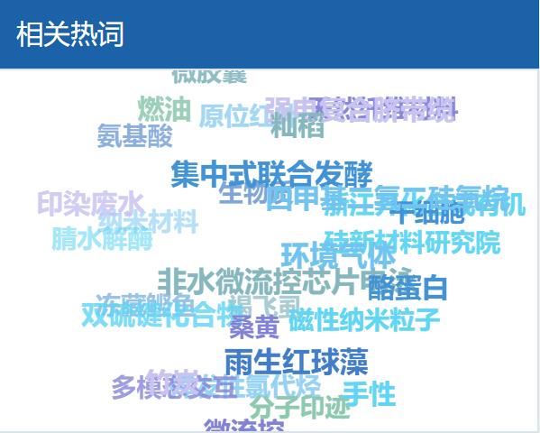系统根据用户的检索条件,将报告的关键词进行统计后,以权重最大的关键词,以3D词云的形式进行展示,用户可点击相关热词, :