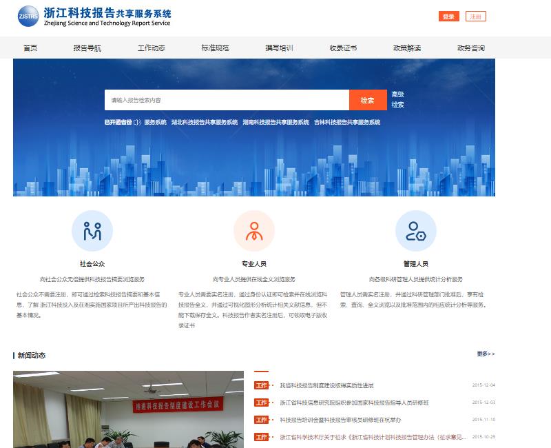 陕西省科技报告服务系统平台首页主要包括:导航栏、分类导引、三种角色用户(社会公众、专业人员、管理人员)、