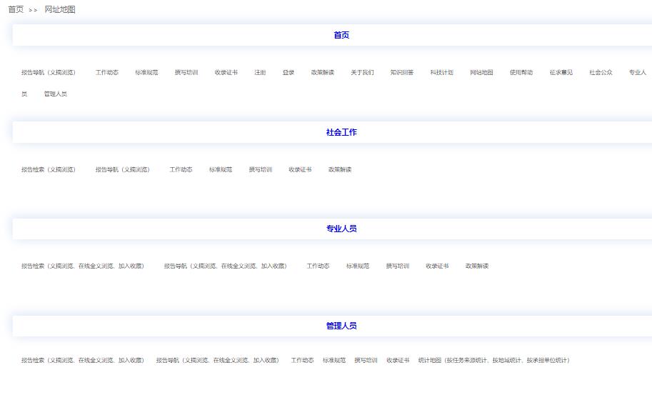 社会公众首页大致分为四部分:导航栏(首页、报告导航、工作动态、标准规范、撰写培训、收录证书、