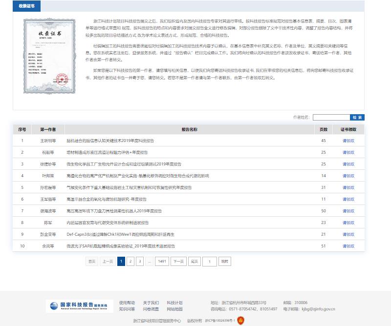 已审核通过的报告,报告作者实名注册并登录到本系统,可以在证书领取栏中点击“请领取”来领取收录证书。